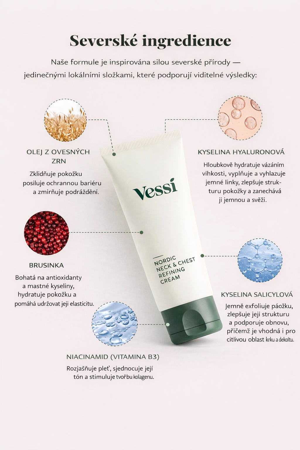 Vessi Nordic Neck & Chest Refining Cream byl vyvinut s použitím dobře prověřených, jemných složek, které jsou vhodné pro všechny typy pleti, včetně velmi citlivé pokožky. Je však třeba mít na paměti, že produkt obsahuje 2 % kyseliny salicylové, které by se měly vyhýbat těhotné ženy.