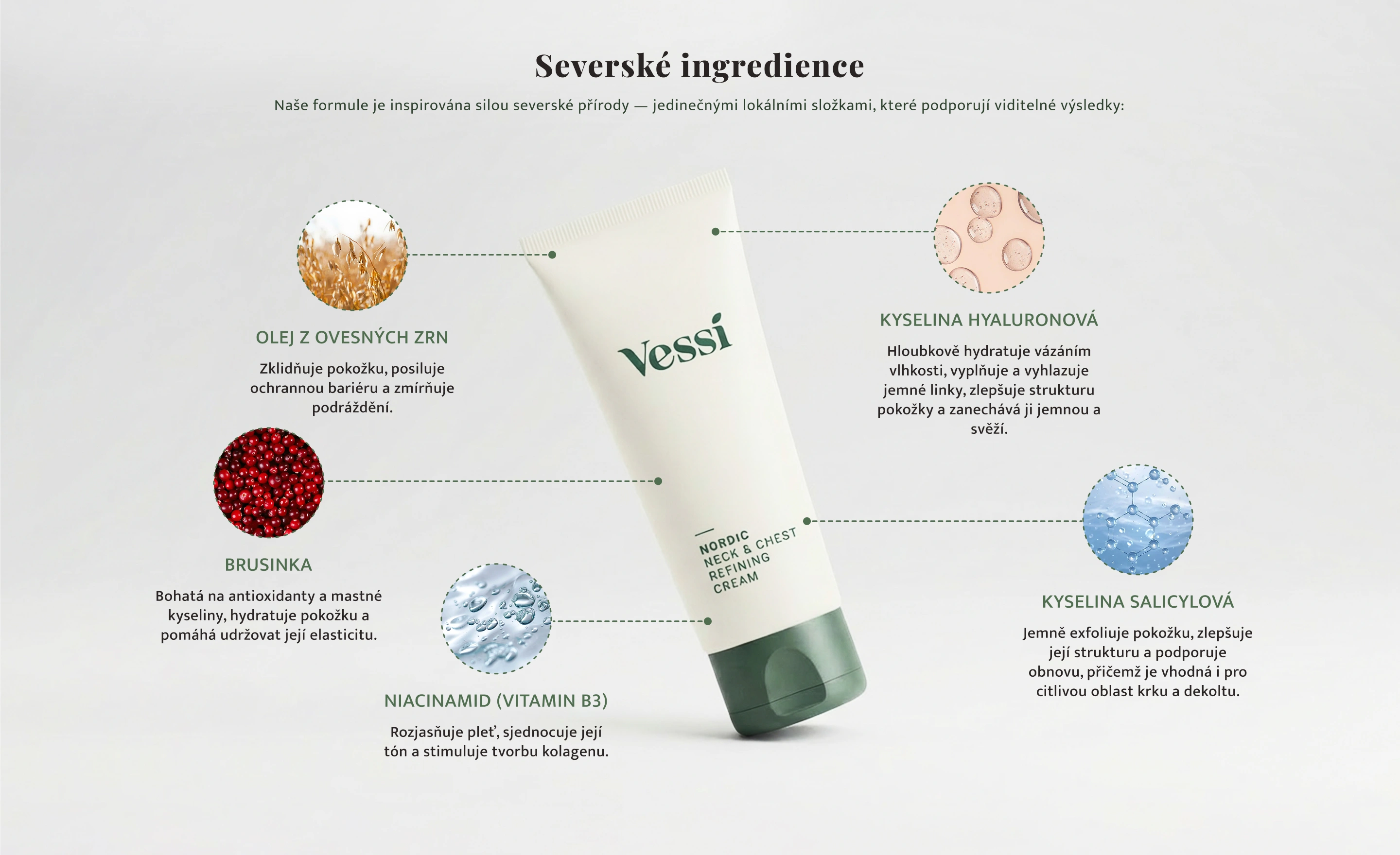 Vessi Nordic Neck & Chest Refining Cream obsahuje vyživující složení navržené pro hloubkovou hydrataci jemné pokožky krku a dekoltu. Zároveň poskytuje zpevňující a vyhlazující účinky, které pomáhají redukovat vrásky, nedokonalosti a jemné linky a dodávají pleti mladistvější vzhled.